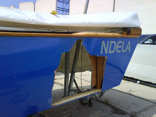 Pero los accidentes no acababan ahí. Tras Lupa, llegaban a sotavento Paco y Calero. Paco iba montando primero, desde un rumbo abierto para comenzar cerrado la cañida; Calero llegaba algo más justo y forzado; una racha impide que Calero pueda controlar el patín y colisiona bestialmente en la popa de Paco, destrozando lieralmente el barco de éste. Calero vuelca y Paco, sin su último metro del casco de babor (sólo le quedaba la quilla y la cubierta), se veía obligado a retirarse casi hundido. Esto lo aprovechaban los de atrás para ganar puestos (tres en concreto). Joaquín y Enrique, que iban justo por detrás de los accidentados, los esquivaban dejándolos entre ellos y la baliza; Climent, quizás con excesiva agresividad, se la jugó pasando entre entre Calero volcado y la baliza, ganando metros y recibiendo la reprimenda de Calero, que veía peligrar su patín en el caso que Climent recibiera una inoportuna racha.